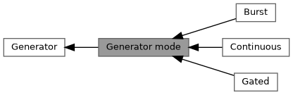 A generator can operate in various different modes: Continuous, Burst or Gated. In Continuous mode, the generator continuously generates the selected signal, until the generator is stopped. In Burst mode, the generator generates a specified number of periods of the selected signal or a specified number of samples from the waveform buffer and then stops automatically. In Gated mode, the generator generates (a part of) the selected signal based on a the precence of an external signal on a selected external input of the generator.